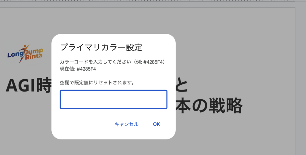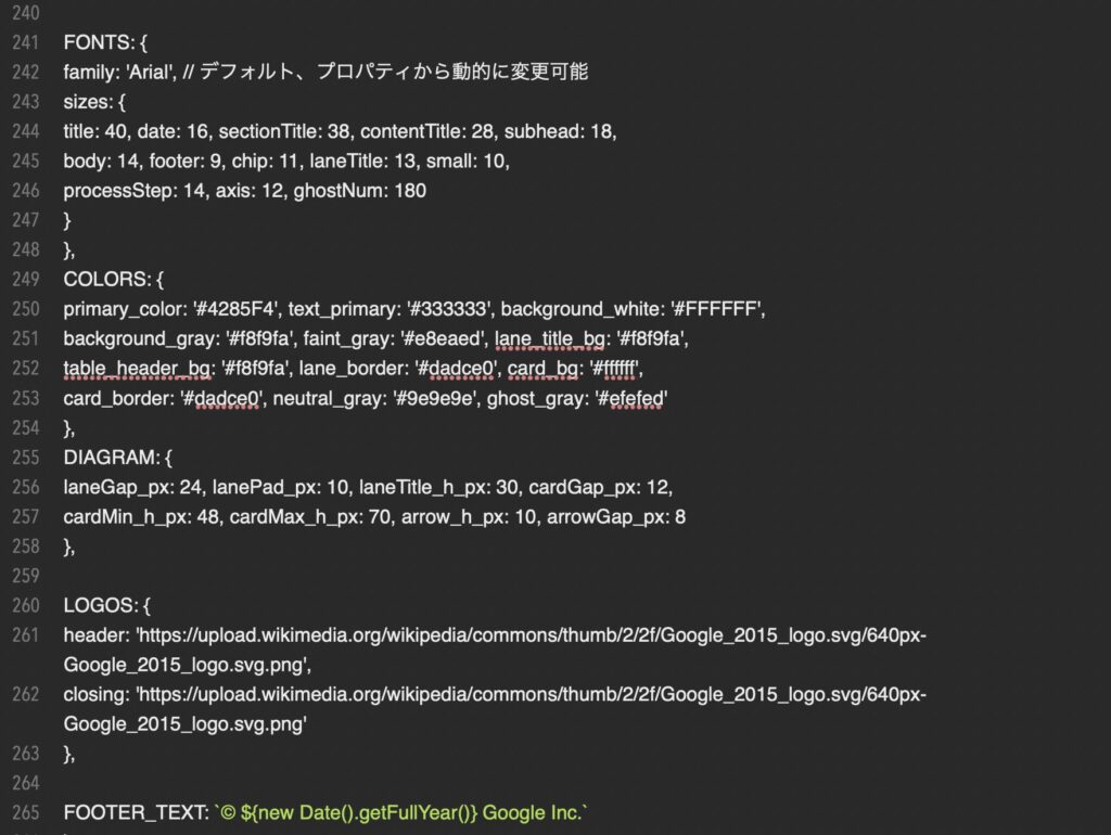 この中で一番重要なのはprimary_blue: '#4285F4',です。ここを変えるだけで、スライド全体の印象が劇的に変わります。