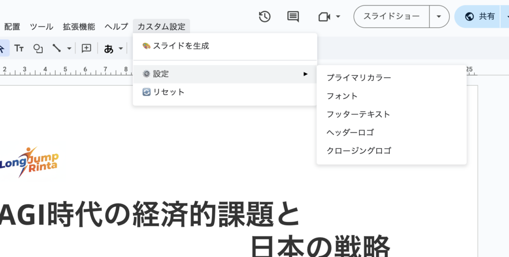 スライドを作ったときにはありませんが、リロードするか、一回閉じてもう一回読み込むと「カスタム設定」がでてきます。